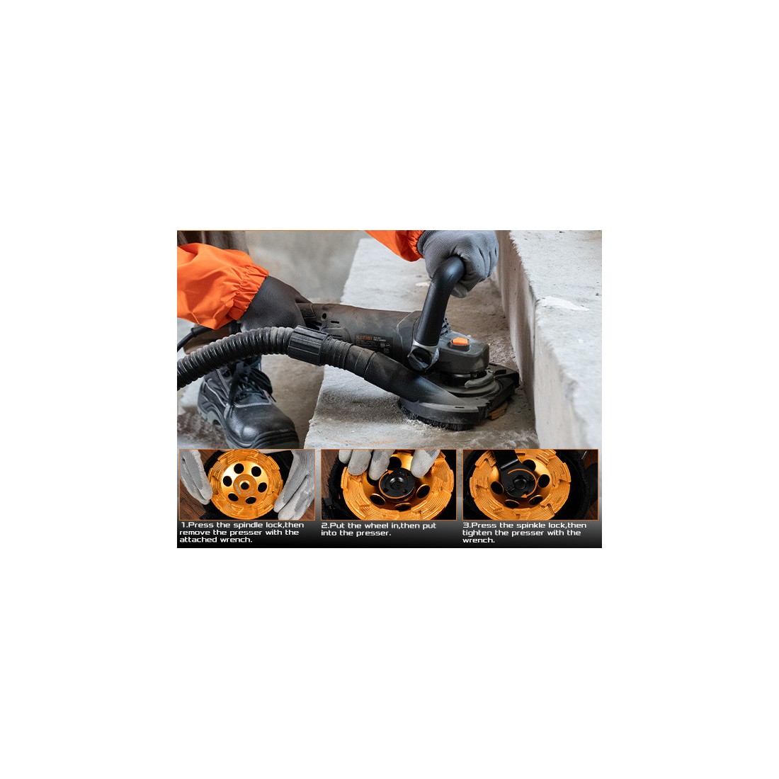 تضم غطاء تجميع غبار بفرش محيطية ومنفذ شفط للاتصال بالمكانس الصناعية، ما يقلل الانبعاثات ويحسّن الرؤية في موقع العمل. هيكل تروس معدني لتحمل العمل المتواصل، ومقبض أمامي قابل للضبط يمنح تحكمًا ثابتًا على الجدران والأرضيات. متوافقة مع كؤوس ألماسية قياس 125 مم وخيوط مغزل قياسية، مما يسهّل تبديل الملحقات وفق نوع السطح.