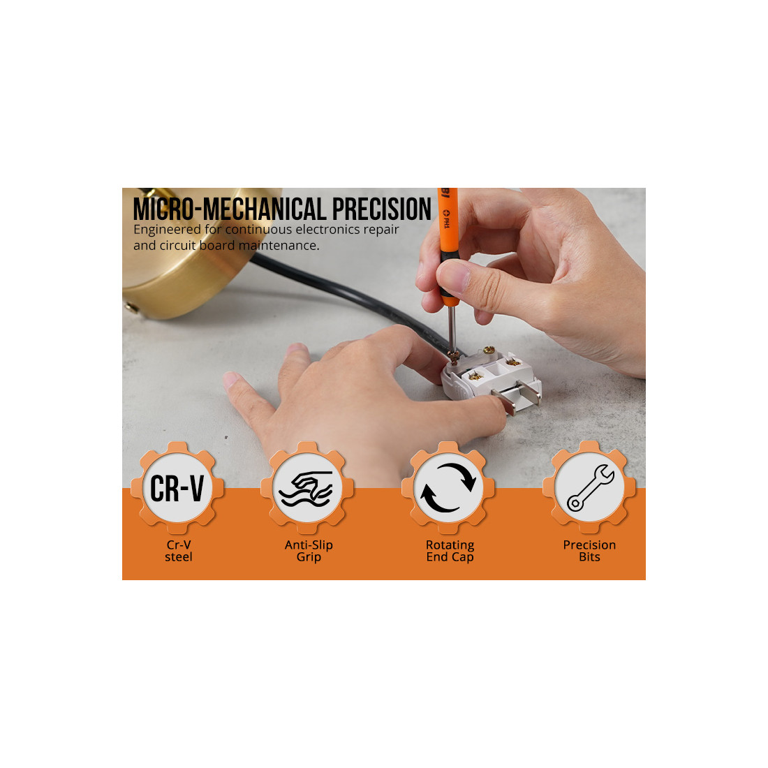 تتميز رؤوس المفكات بخاصية المغناطيسية، مما يسهل تثبيت البراغي الدقيقة ويمنع فقدانها أثناء العمل. بالإضافة إلى ذلك، يأتي كل مفك بلمسة نهائية سوداء تضيف مظهرًا احترافيًا مع تحسين مقاومة السطح للصدأ.