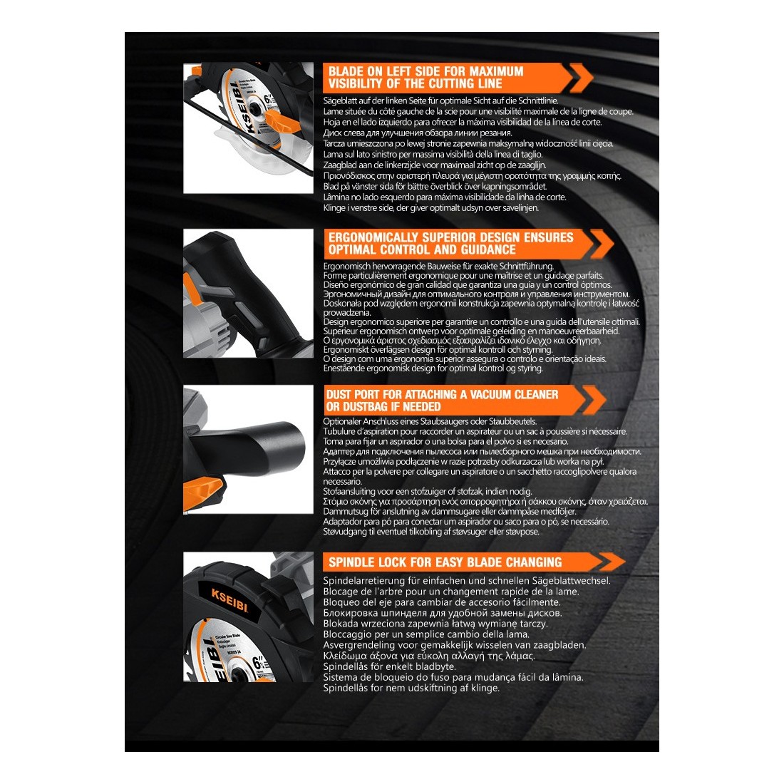 With a 165mm blade, the saw is perfectly suited for clean, precise cuts in wood, plywood, and similar materials. Its compact design and ergonomic grip enhance control and reduce fatigue during extended use, while its robust construction reflects KSEIBI's commitment to durability and long-term performance.