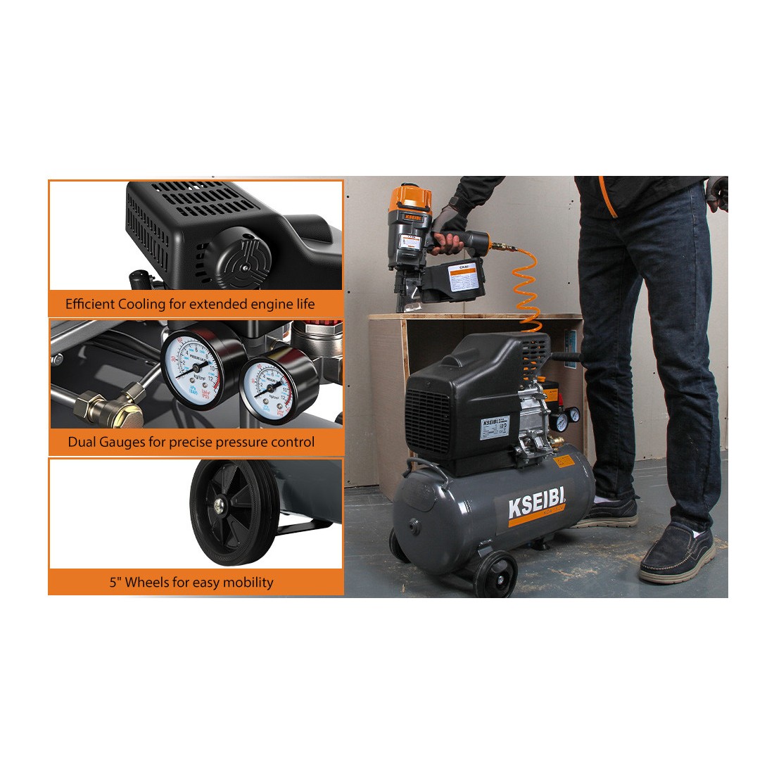 Made with a durable steel reservoir and robust components aligned with KSEIBI’s focus on precision and reliability, this unit offers practical capacity and power without taking up floor space—ideal where portable, consistent compressed air is needed.