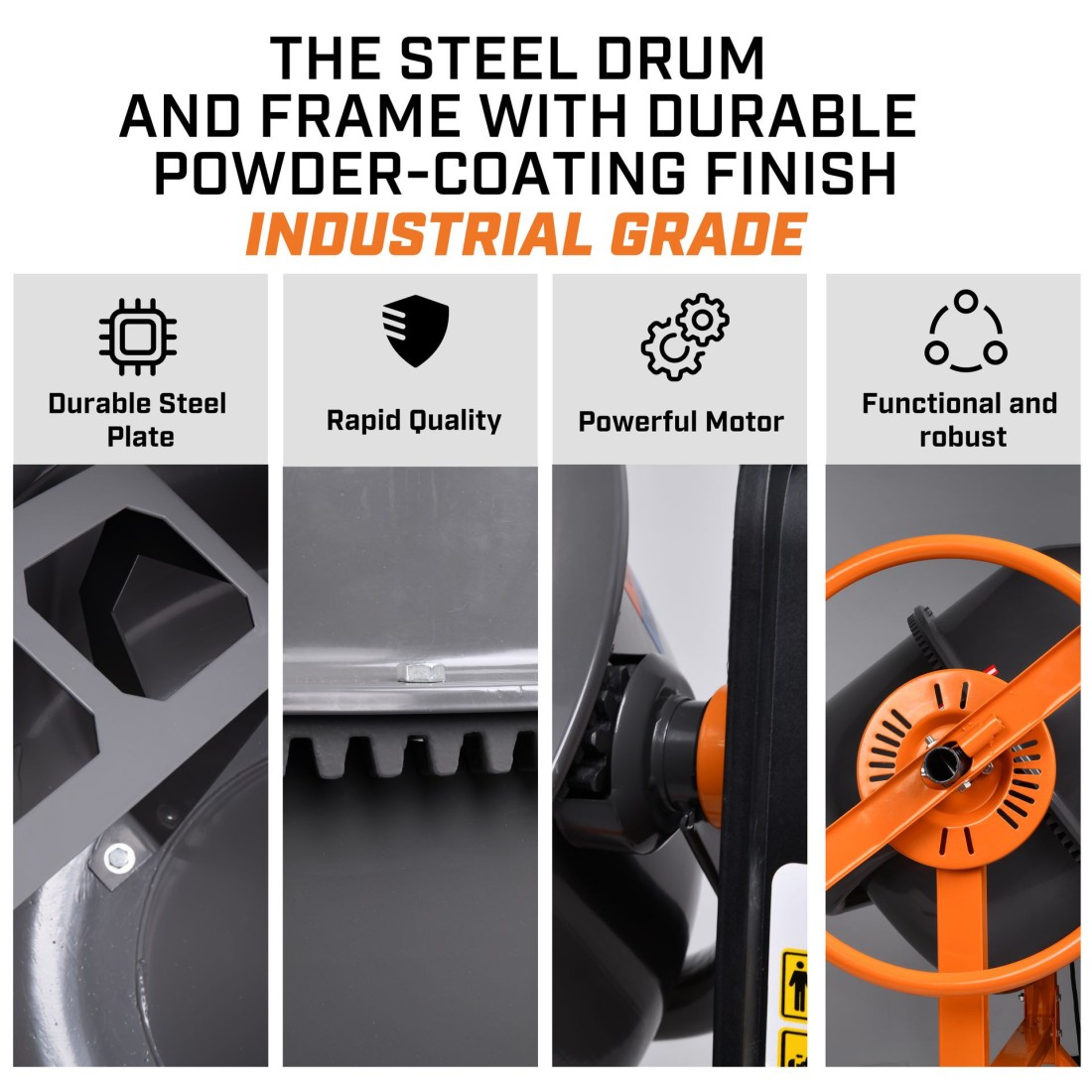 Crafted for durability and performance, its steel drum is built to withstand heavy-duty use, while the stable frame and compact design make it easy to maneuver on job sites. The mixer’s balanced construction minimizes vibrations during operation, contributing to both safety and ease of use.