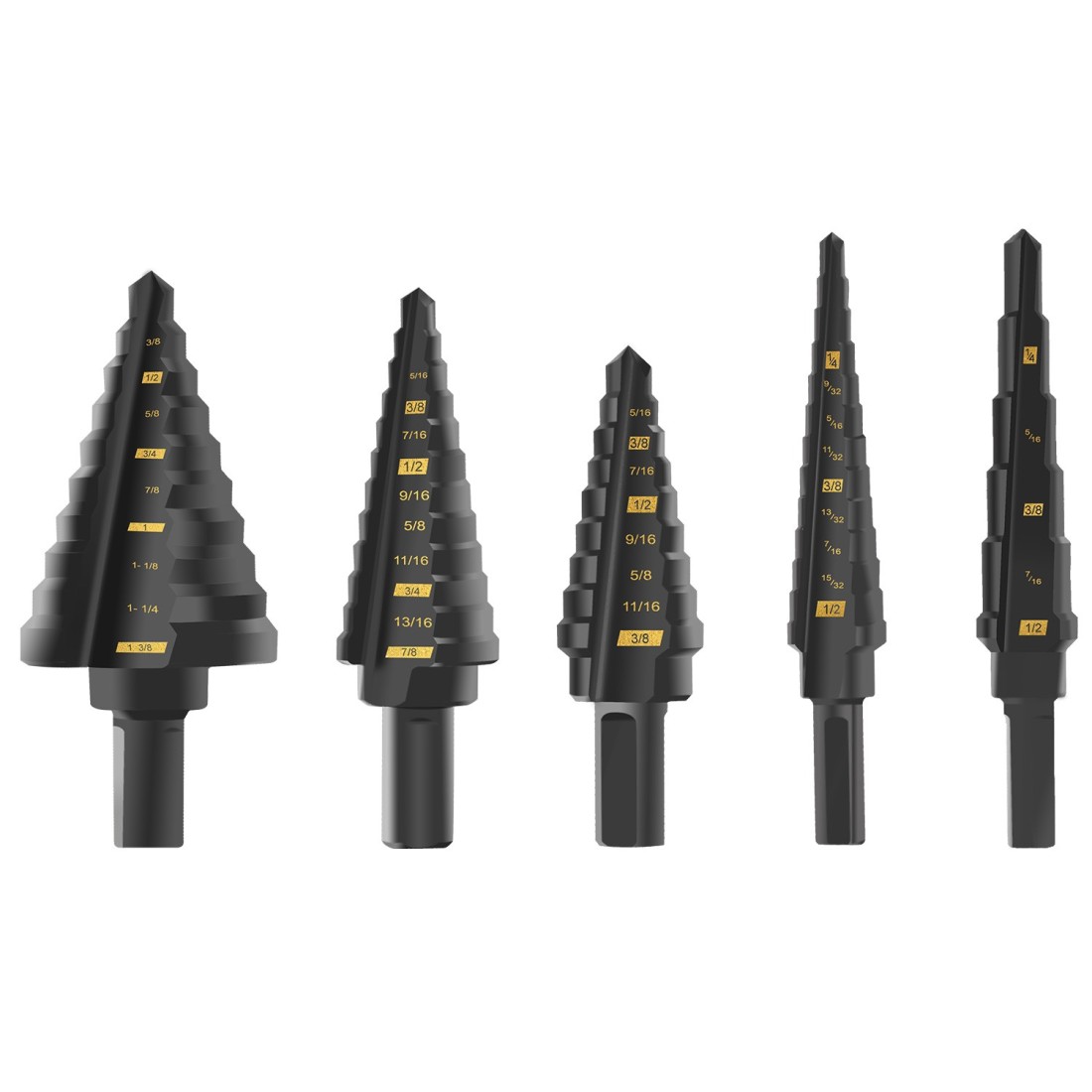 - Each bit features multiple step sizes for versatile drilling needs.
