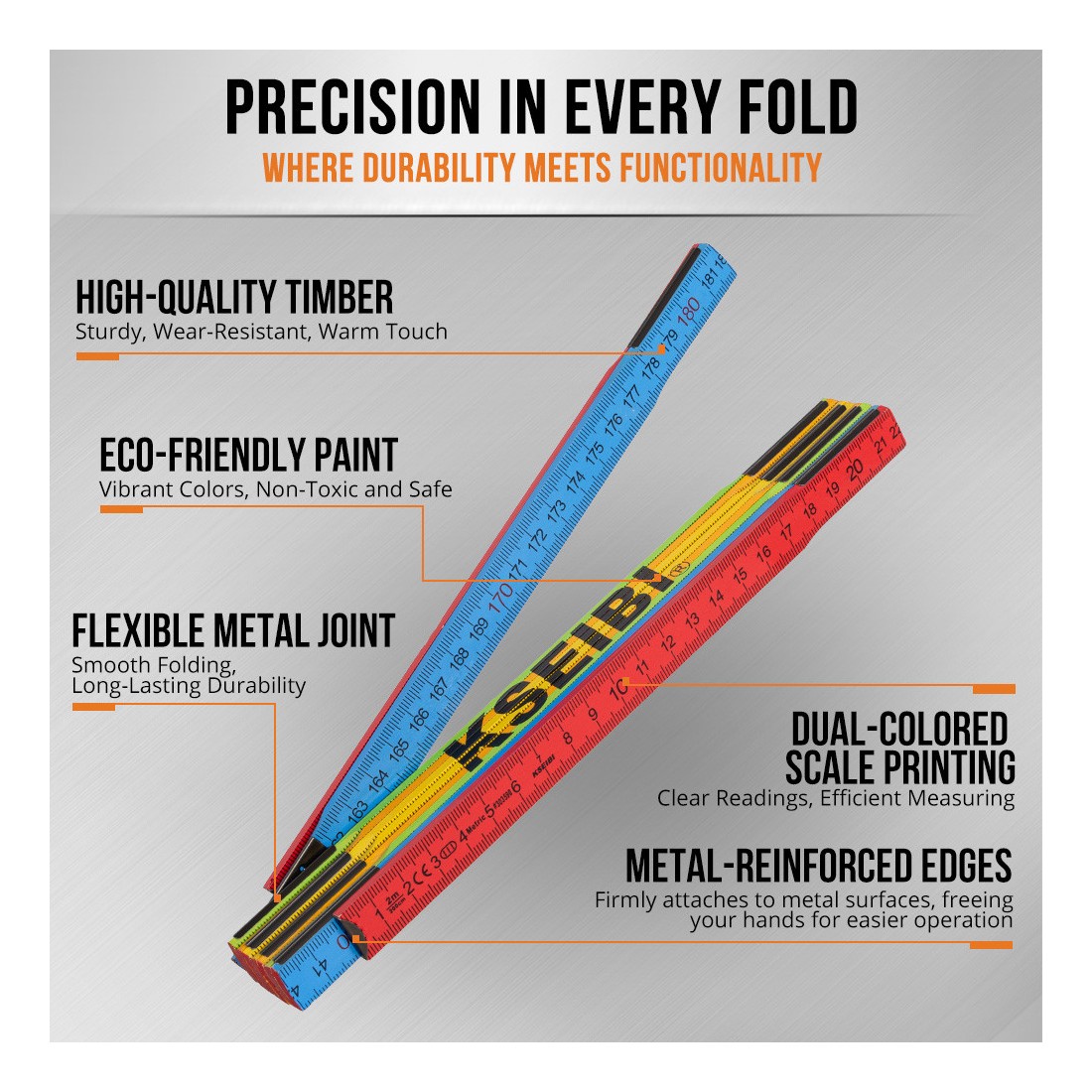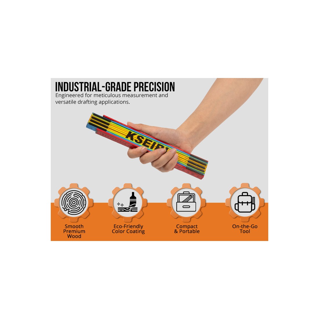 The KSEIBI Wooden Folding Ruler combines the durability of a steel body with the natural precision of wooden measuring arms, making it an essential tool for accurate measuring and marking