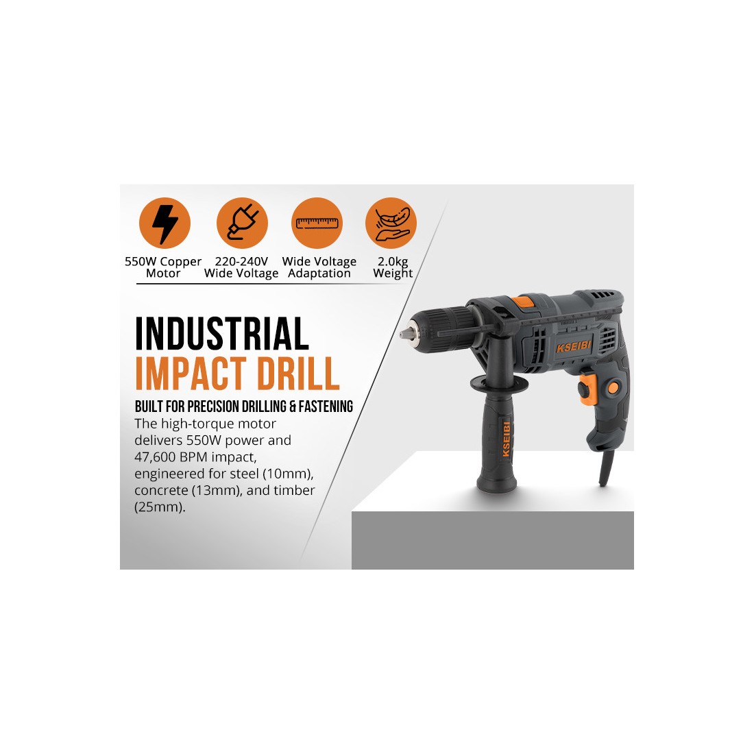 ساختار مستحکم و طراحی ارگونومیک دستگاه، تجربهای راحت و مطمئن را حتی در پروژههای طولانیمدت ارائه میدهد. دستگاه سوراخکاری تأثیری كسيبي KSB 580 D انتخابی مناسب برای صنعتگران و تکنسینهایی است که به ابزاری بادوام و دقیق نیاز دارند.