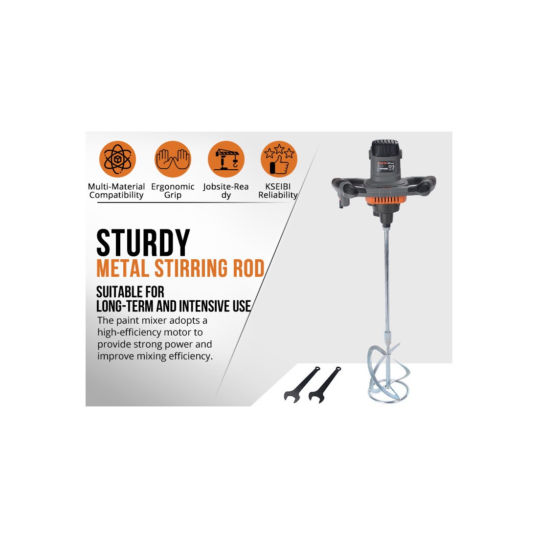 Миксер изготовлен из прочных износостойких материалов, что гарантирует надежность и долговечность в профессиональных условиях. Совместим с различными типами строительных смесей, включая краски, штукатурки и клеи, он упрощает подготовку материалов и повышает точность работы.