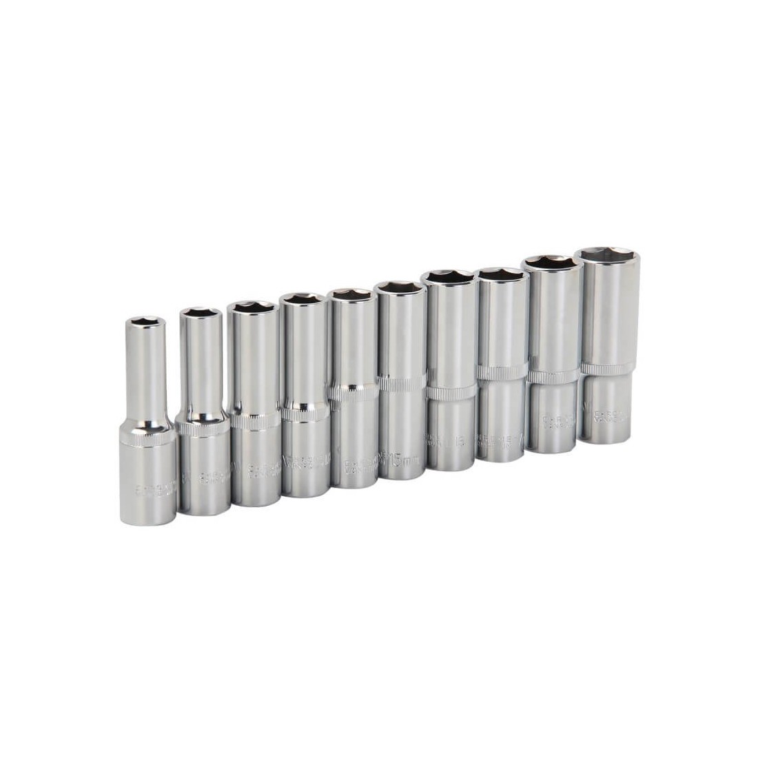 Глубокая шестигранная головка 3/8" метрическая изготовлена из хромованадиевой стали для высокой прочности и долговечности.