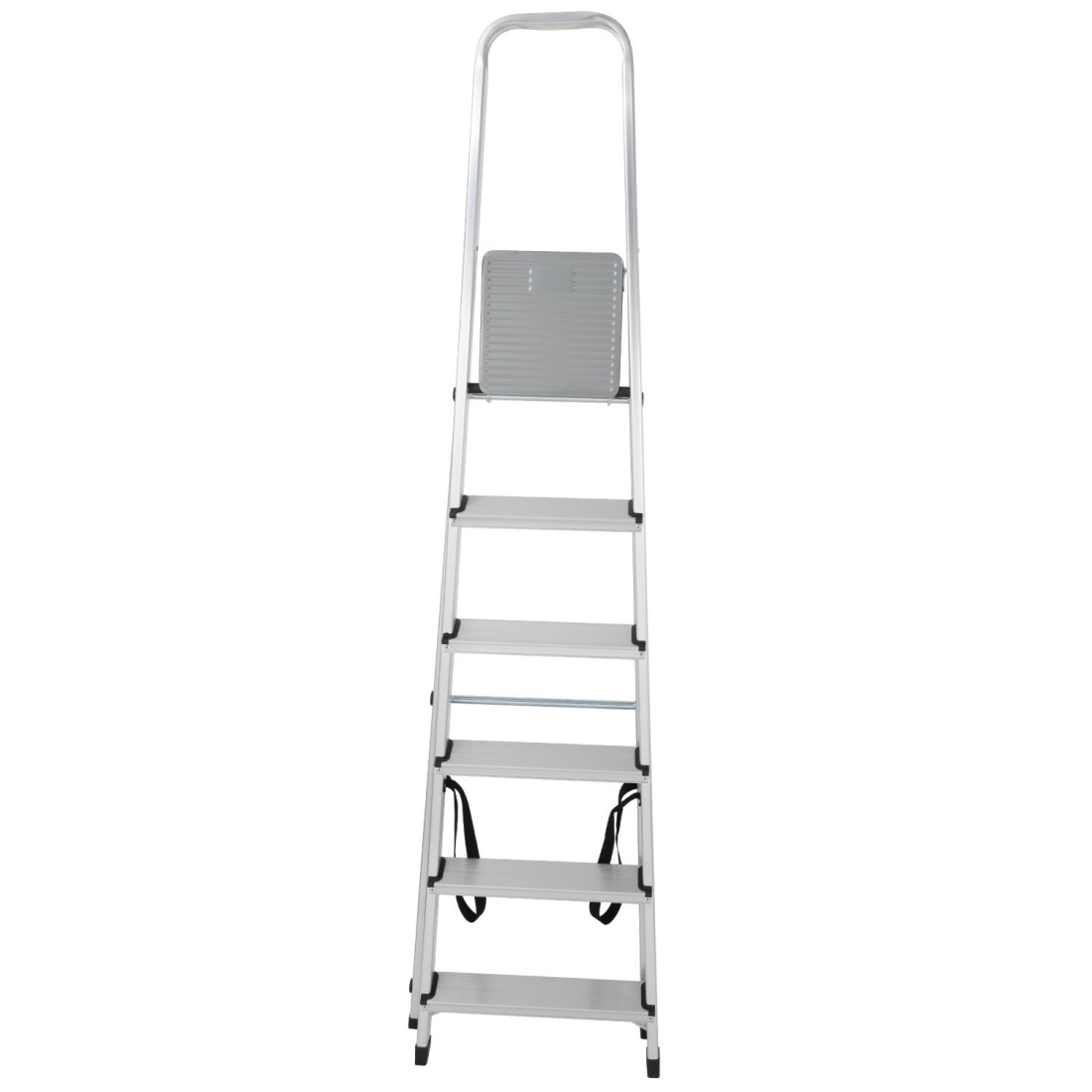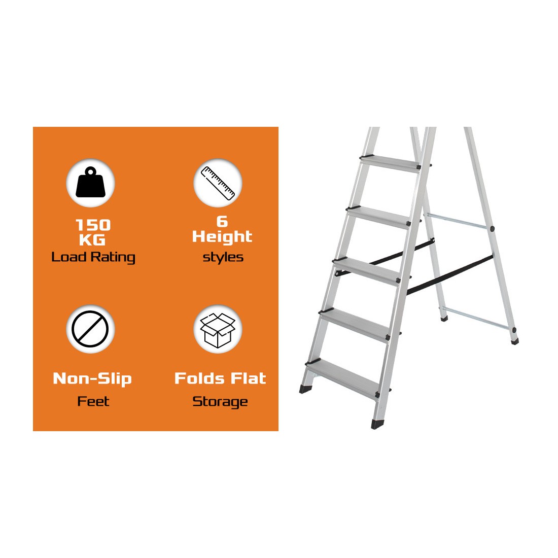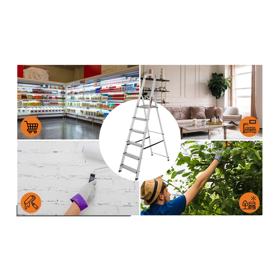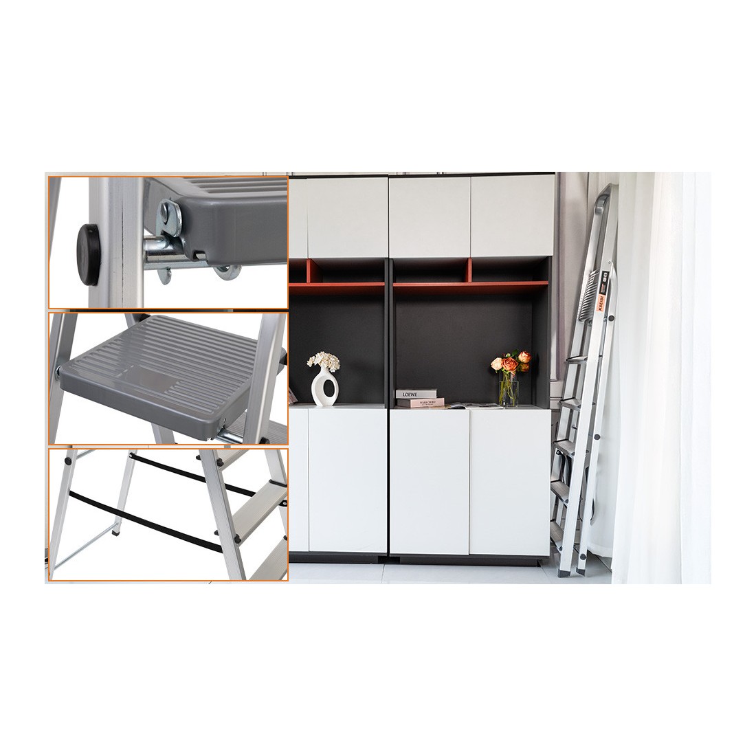 KSEIBI 铝合金家用折叠梯为日常登高作业提供稳定支撑,适用于室内维护、灯具更换、置物取放及简易涂装。采用轻量铝合金框架与加宽踏板,承重扎实、搬运不费力;踏面带防滑纹理,四角配防滑脚套,减少地面刮擦并提升抓地力。弧形扶手便于上手,横撑锁定结构在展开后形成稳固三角支撑,收合则纤薄省空间。