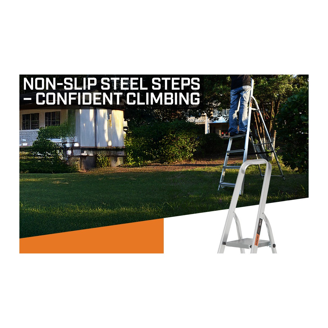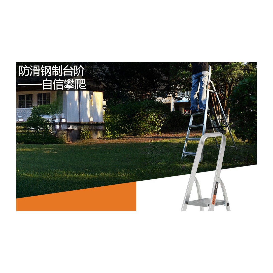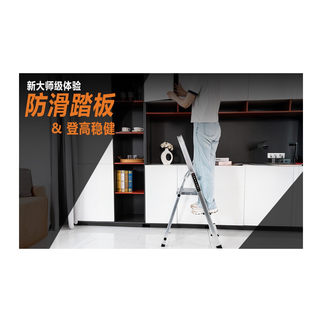 KSEIBI 铝合金家用折叠梯为日常登高作业提供稳定支撑,适用于室内维护、灯具更换、置物取放及简易涂装。采用轻量铝合金框架与加宽踏板,承重扎实、搬运不费力;踏面带防滑纹理,四角配防滑脚套,减少地面刮擦并提升抓地力。弧形扶手便于上手,横撑锁定结构在展开后形成稳固三角支撑,收合则纤薄省空间。...