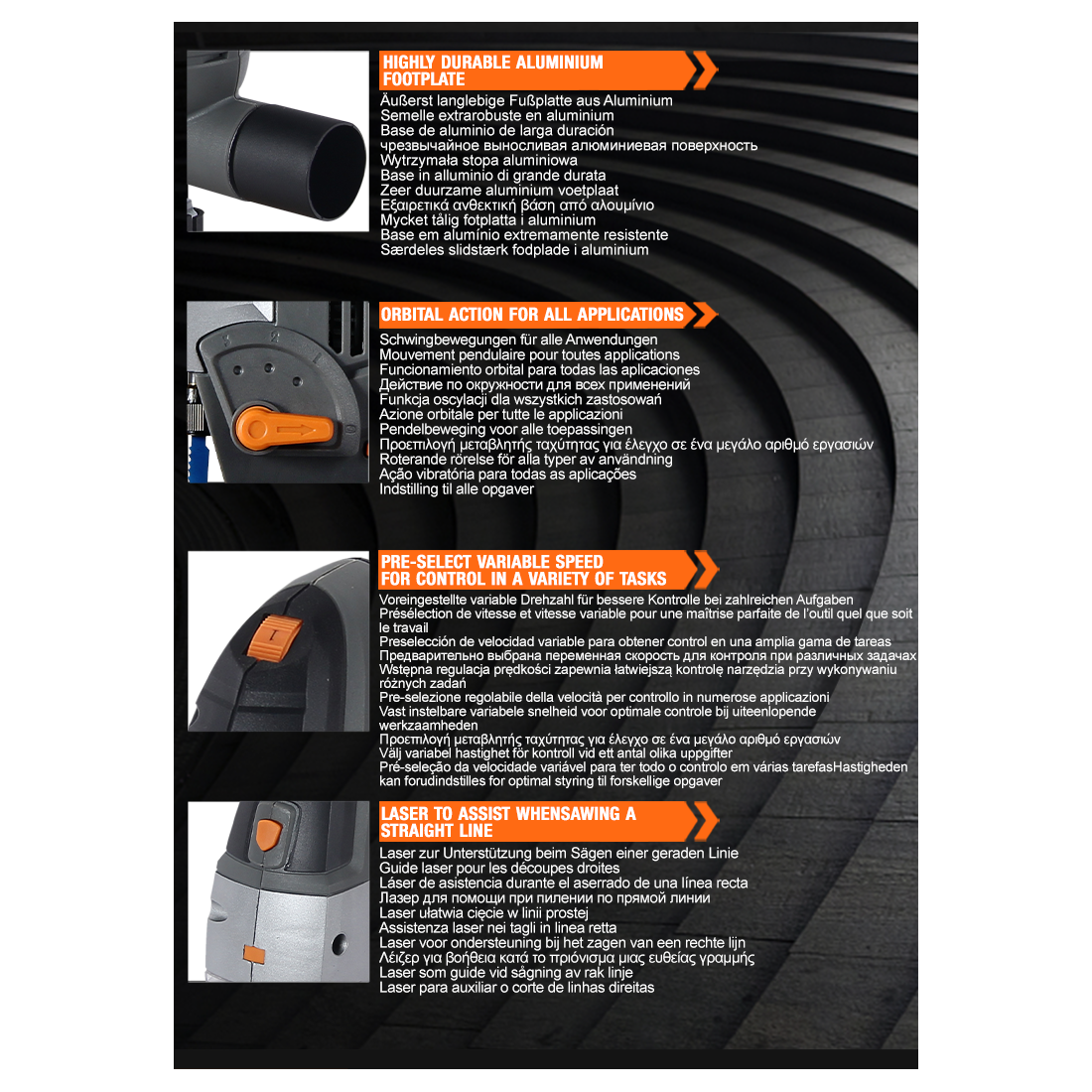 该曲线锯配备激光导向系统,确保切割路径清晰可见,从而显著提高操作精度,减少返工几率。23mm的切割冲程长度与800-3000次/分钟的变速范围相结合,使用户可以根据不同材料灵活调整工作速度,获得平滑均匀的切割效果。