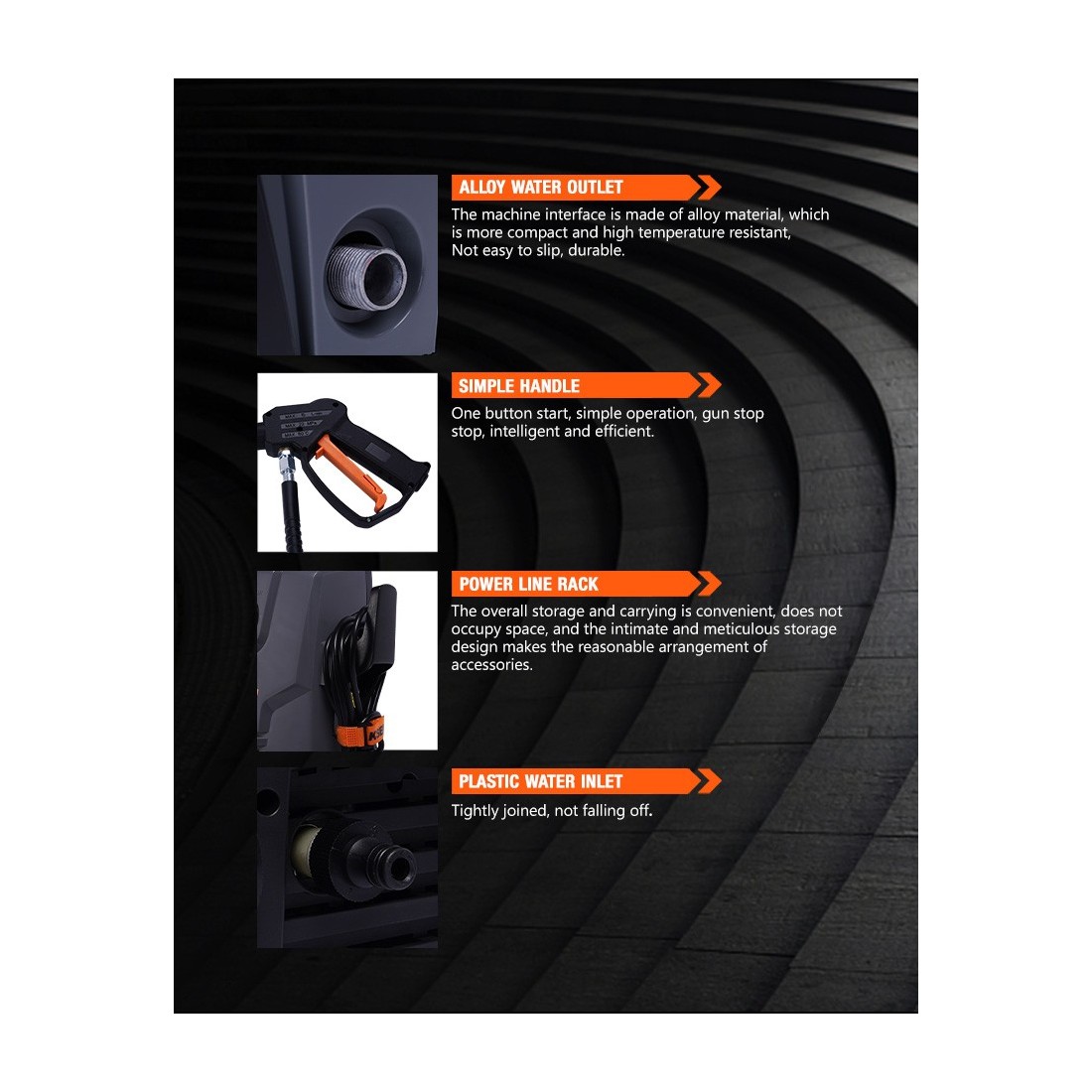 - 配备长电缆和高压软管,方便远距离清洁作业。