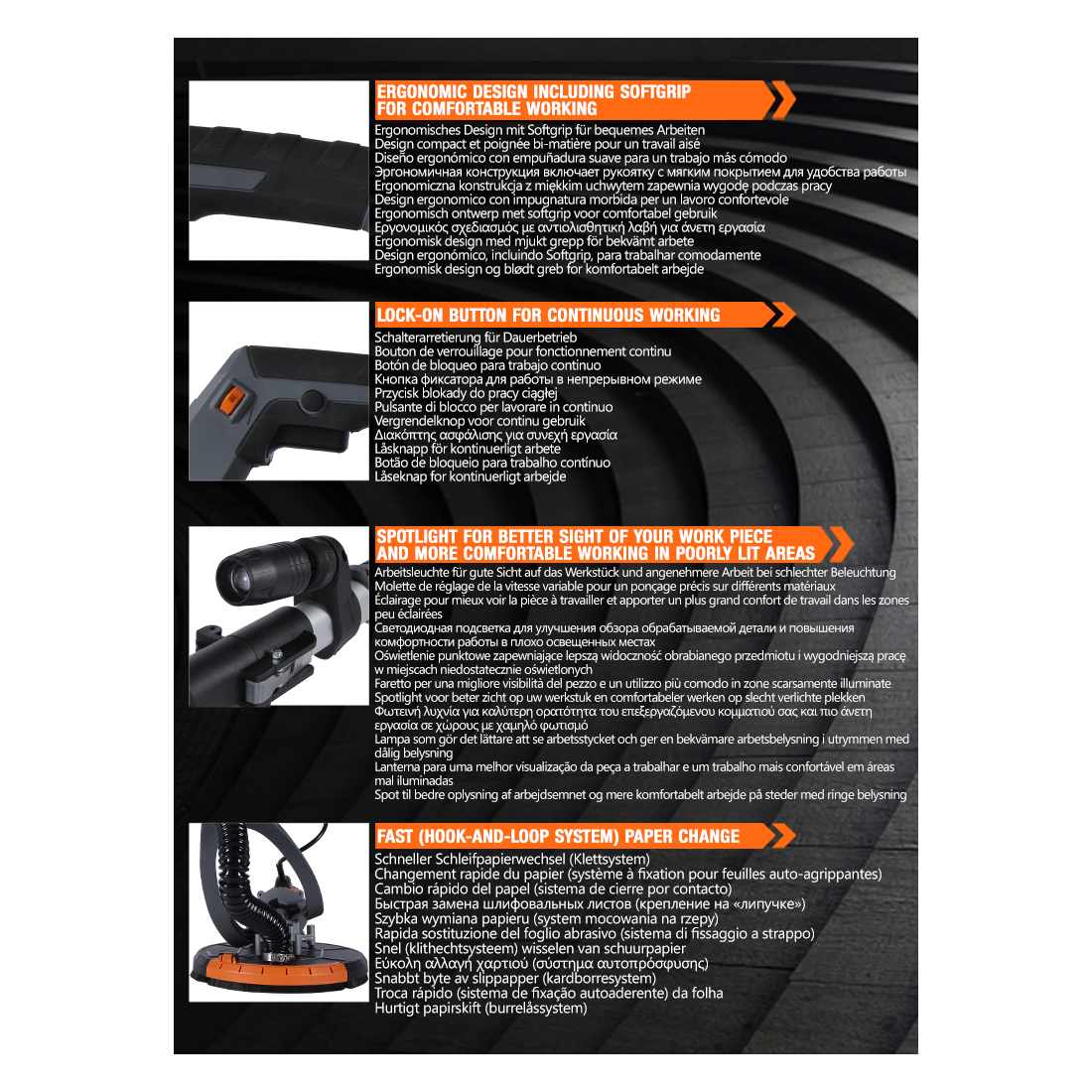 无论是专业建筑施工队还是装修承包商,这款砂光机都能满足其对效率与精度的双重需求。结合 KSEIBI 独有的可靠性和持久耐用性,KDS 75-225V 是值得信赖的墙面打磨解决方案。