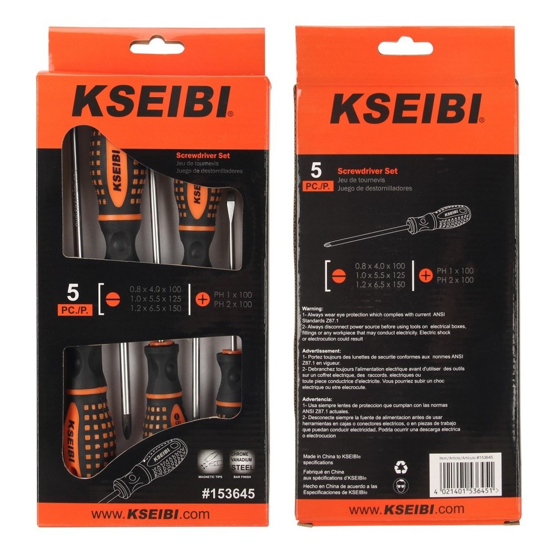 产品采用彩盒包装,方便存储和展示,适合专业技术工人、维修人员,以及需要高性能工具的企业使用。凭借 KSEIBI 一贯的耐用性和精确性,这款 5 件套螺丝刀组合是各类手动工具应用中的理想选择。